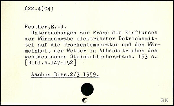 Untersuchungen zur Frage de3 Einflusses der Wärmeabgabe elektrischer Betriebsmittel auf die Trockentemperatur und den Wärmeinhalt der Wetter in Abbaubetrieben des westdeutschen Steinkohlenbergbaus.