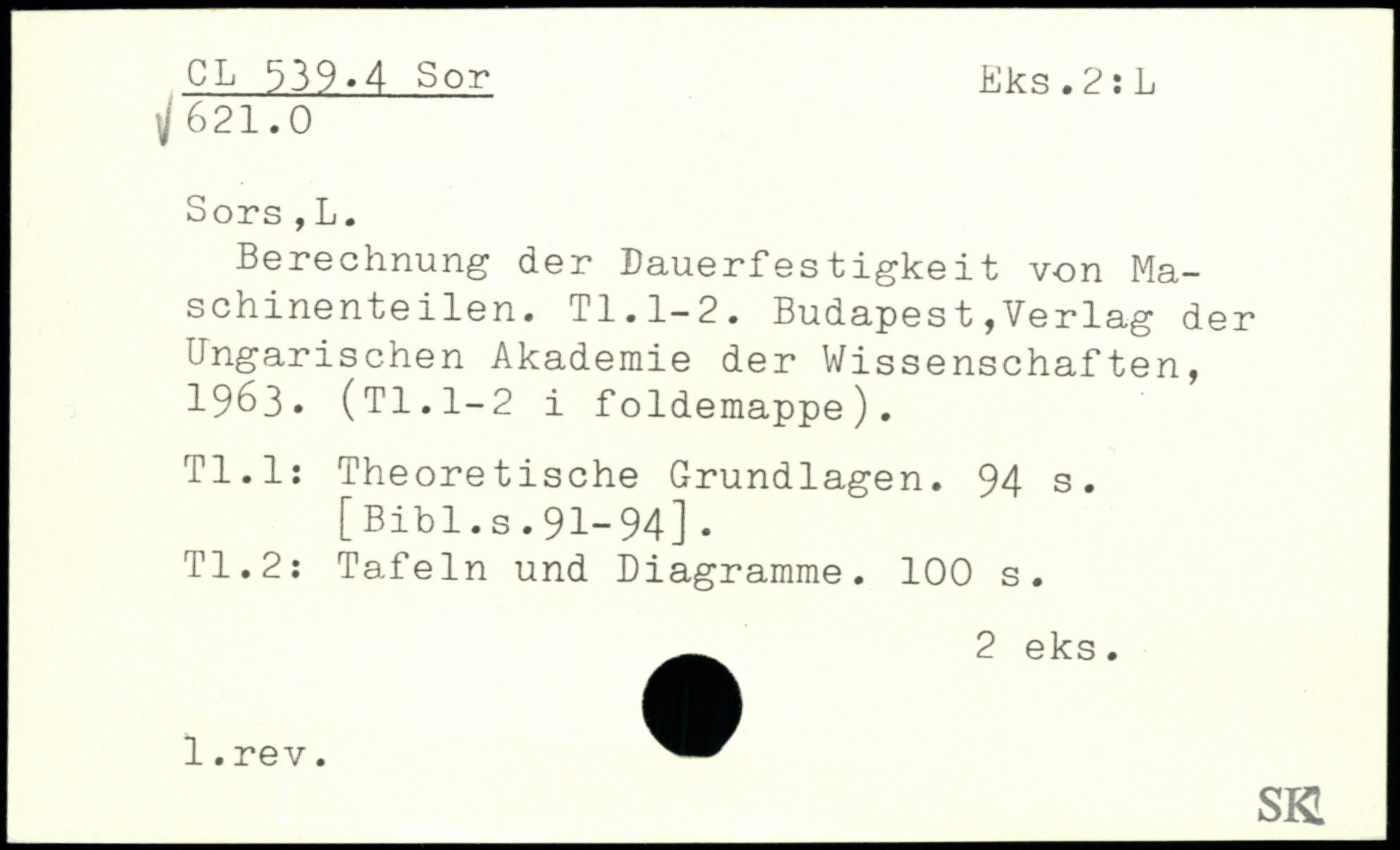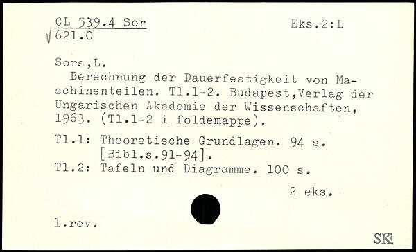 Berechnung der Dauerfestigkeit von Maschinenteilen. TI.1-2. Budapest,Verlag der Ungarischen Akademie der Wissenschaften, 1963. (Tl.1-2 i foldemappe). Tl.l: Theoretische Grundlagen.