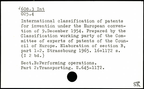 International classification of patents for invention under the European convention of 9,December 1954. Prepared by the Glassification working party of the Committee of experts of patents of the Council of Europe. Elaboration of section B, part 1-2. Strassbourg 1965