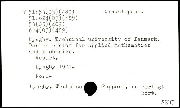 Lyngby. Technical university of Denmark. Danish center for applied mathematics and mechanics. Report. Lyngby 1970- No. 1- Lyngby. TechnicRapport, se særligt kort.