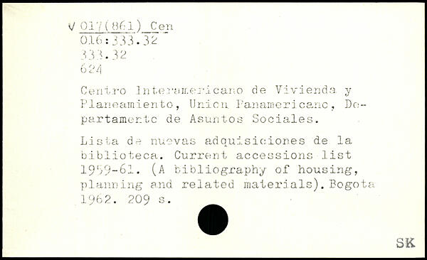 Centro Inte.rnir.erica.no de Vivienda y Planeamiento , Union. Fanameri canc , De-pa.rtamer.tc de Asuntos Sociales. Lista de nuevas adquisiciones de la biblioteca. Current accessions list 1939-61. (A bibliography of housing, planning and related materials). Bogota 1962.