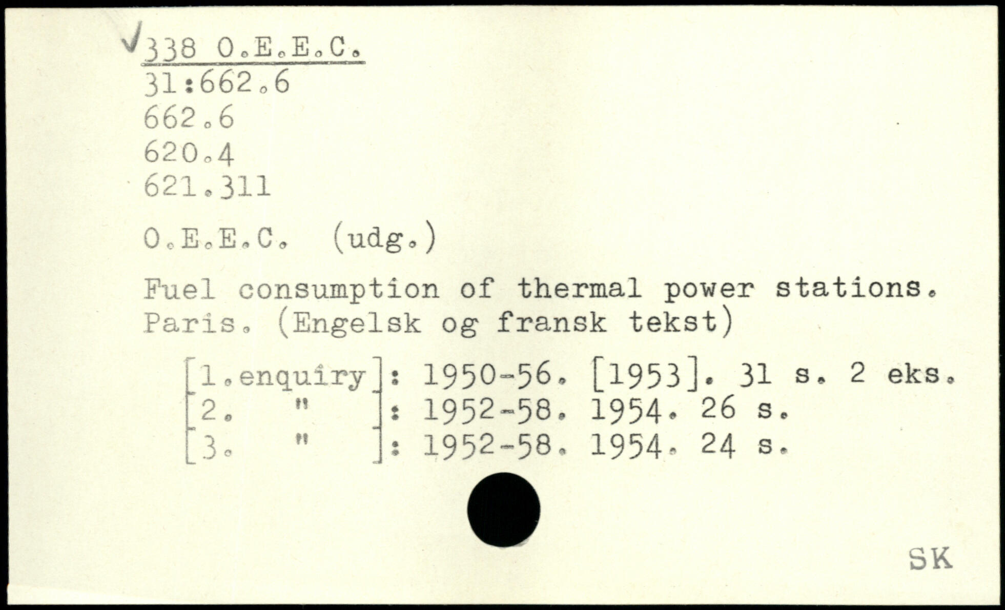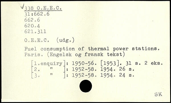 OeE,E.C, (udg,) Fuel consumption of thermal power stations. Paris, (Engelsk og fransk tekst) 1.enquiry : 1950-56. [1953J.