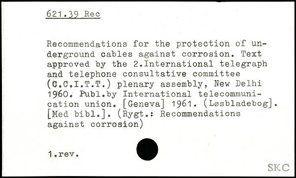 Recommendations for the protection of underground cables against corrosion. Text approved by the 2.International telegraph and telephone consultative committee (C.C.I.T.T.) plenary assembly, New Delhi 1960.