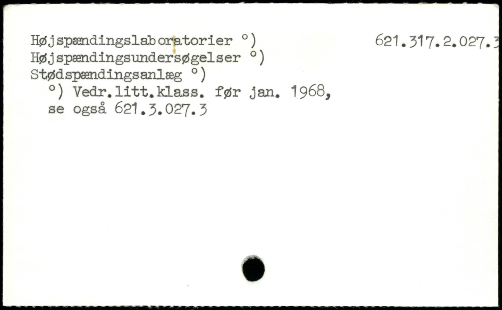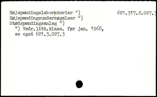 Høj spændingslat oratorier .) 621.317.2.027.3 Høj spændingsundersøgelser 0) Stødspændingsanlæg .) .) Vedr.litt.klass, før jan. 1968, se også 62I.3.O27.3