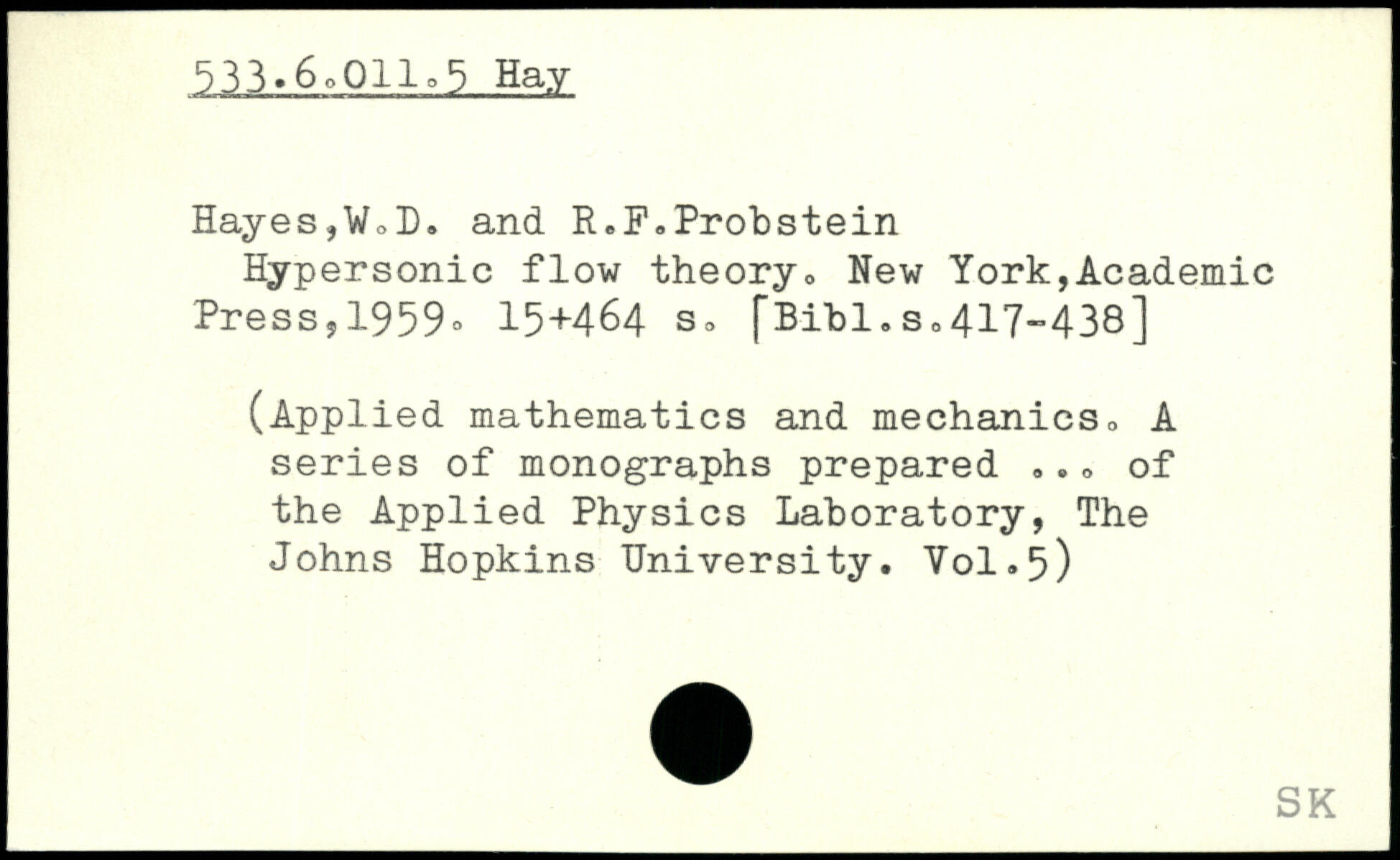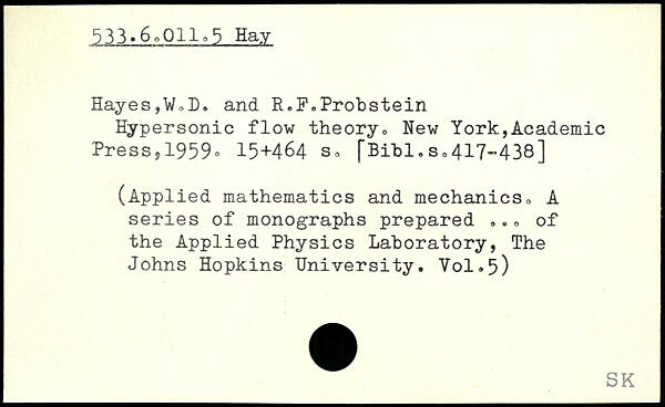 Hypersonic flow theory, New York,Academic Press,1959=> 15+464 s, fBibl.s,417-438] (Applied mathematics and mechanics, A series of monographs prepared .., of the Applied Physics Laboratory, The Johns Hopkins University. V0I.5)