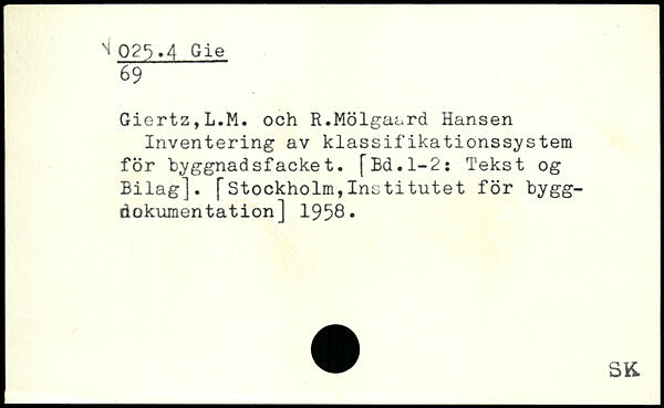 Giertz,L.M. och R.Molgaard Hansen Inventering av klassifikationssystem for byggnadsfacket. [Ed.1-2: Tekst og Bilag]. [Stockholm,Institutet for bygg-dokumentation] 1958.