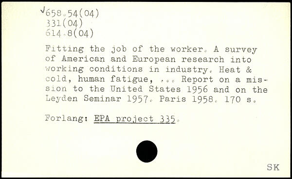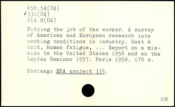 Pitting the job of the worker., A survey of American and European research into working conditions in industry. Heat & cold, human fatigue, 9O0 Report on a mission to the United States 1956 and on the Leyden Seminar 1957.