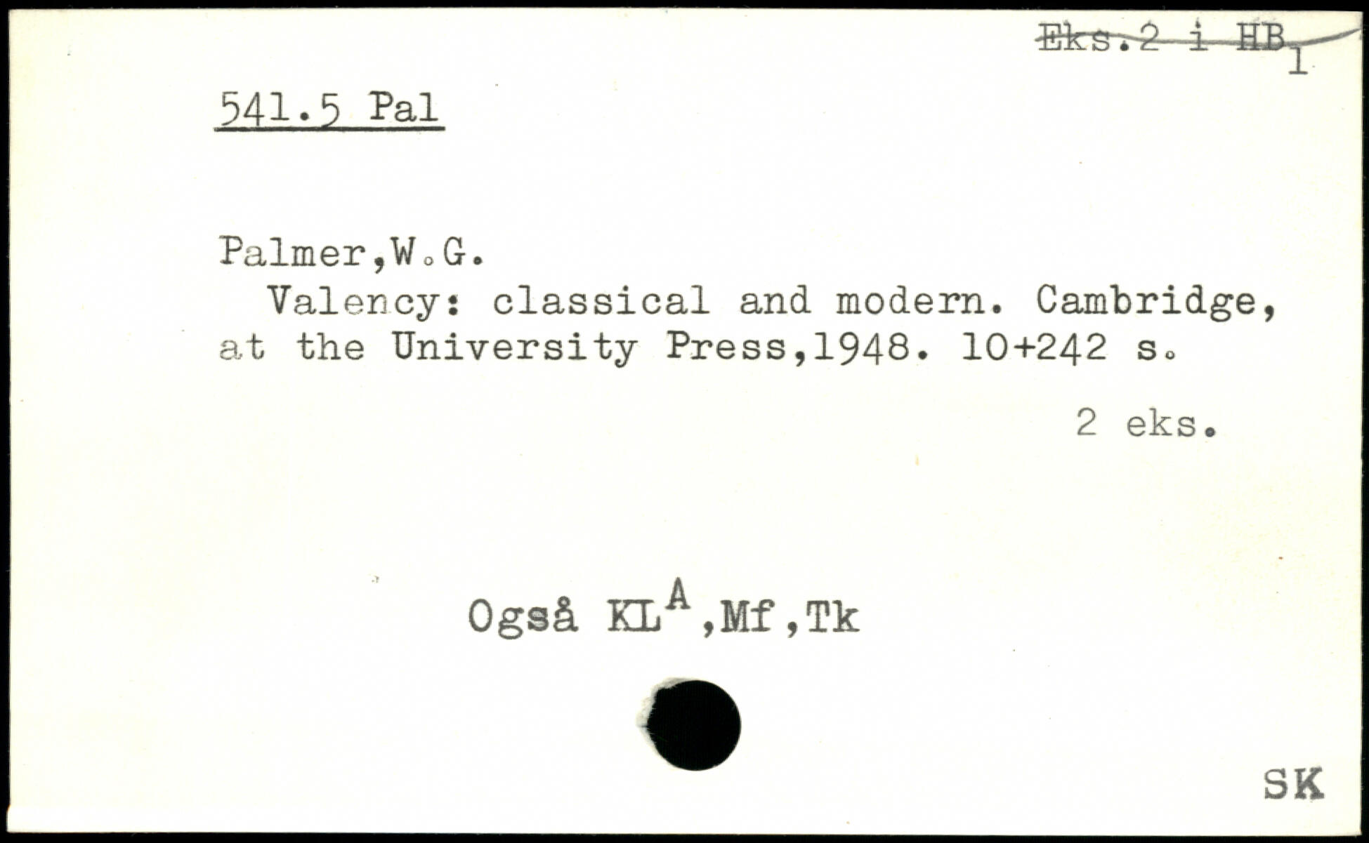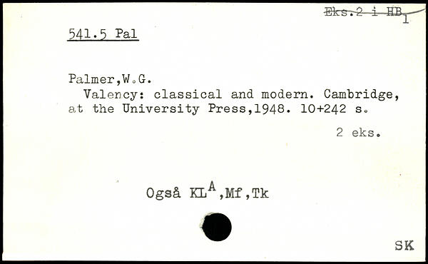 -Ek-s-rft-i HB|- 541.5 Pal Palmer,W0 G. Valency: classical and modem. Cambridge, at the University Press, 1948.