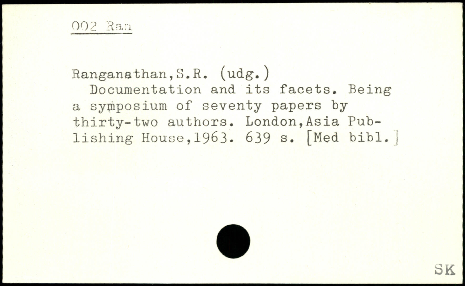 Documentation and its facets. Being a symposium of seventy papers by thirty-two authors.