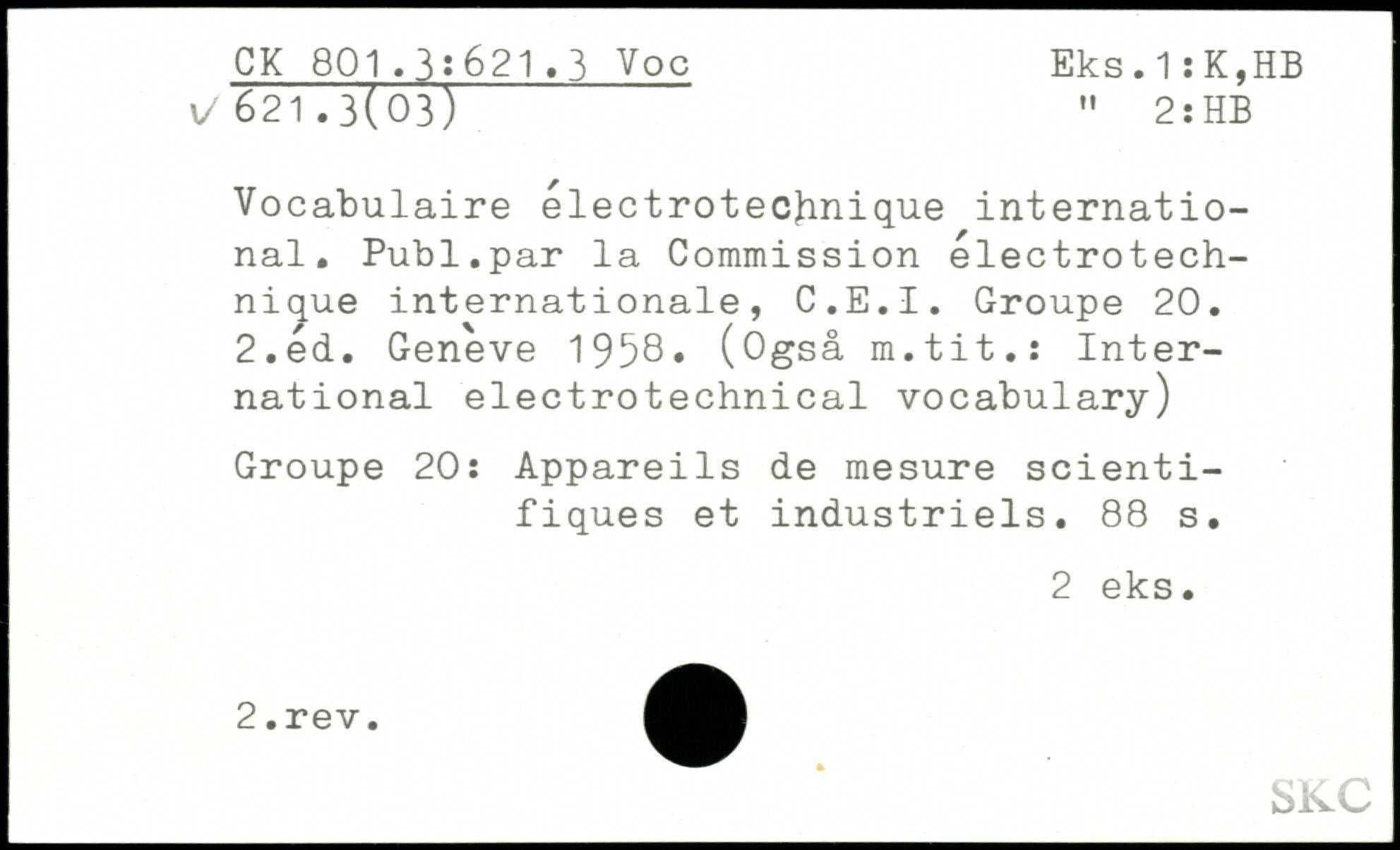 Vocabulaire électrotechnique international. Publ.par la Commission electrotech-nique internationale, C.E.I. Groupe 20. 2.éd. Geneve 1958, (Ogsâ m.tit.: International electrotechnical vocabulary) Groupe 20: Appareils de mesure scientifiques et industriels.