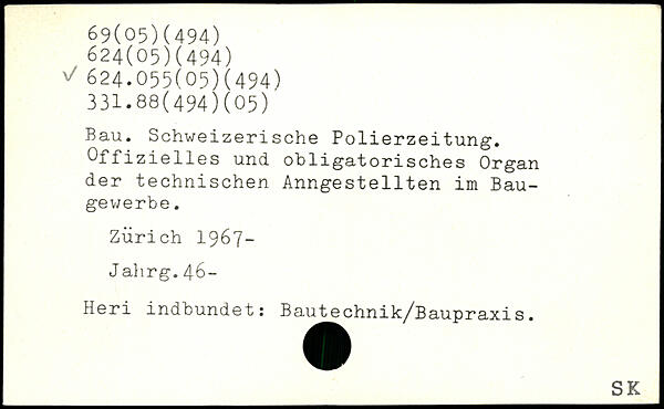 Bau. Schweizerische Polierzeitung. Offizielles und obligatorisches Organ der technischen Anngestellten im Bau-gewerbe. Zürich 1967- J ahrg.46- Heri indbundet: Ba.utechnik/Baupraxis.