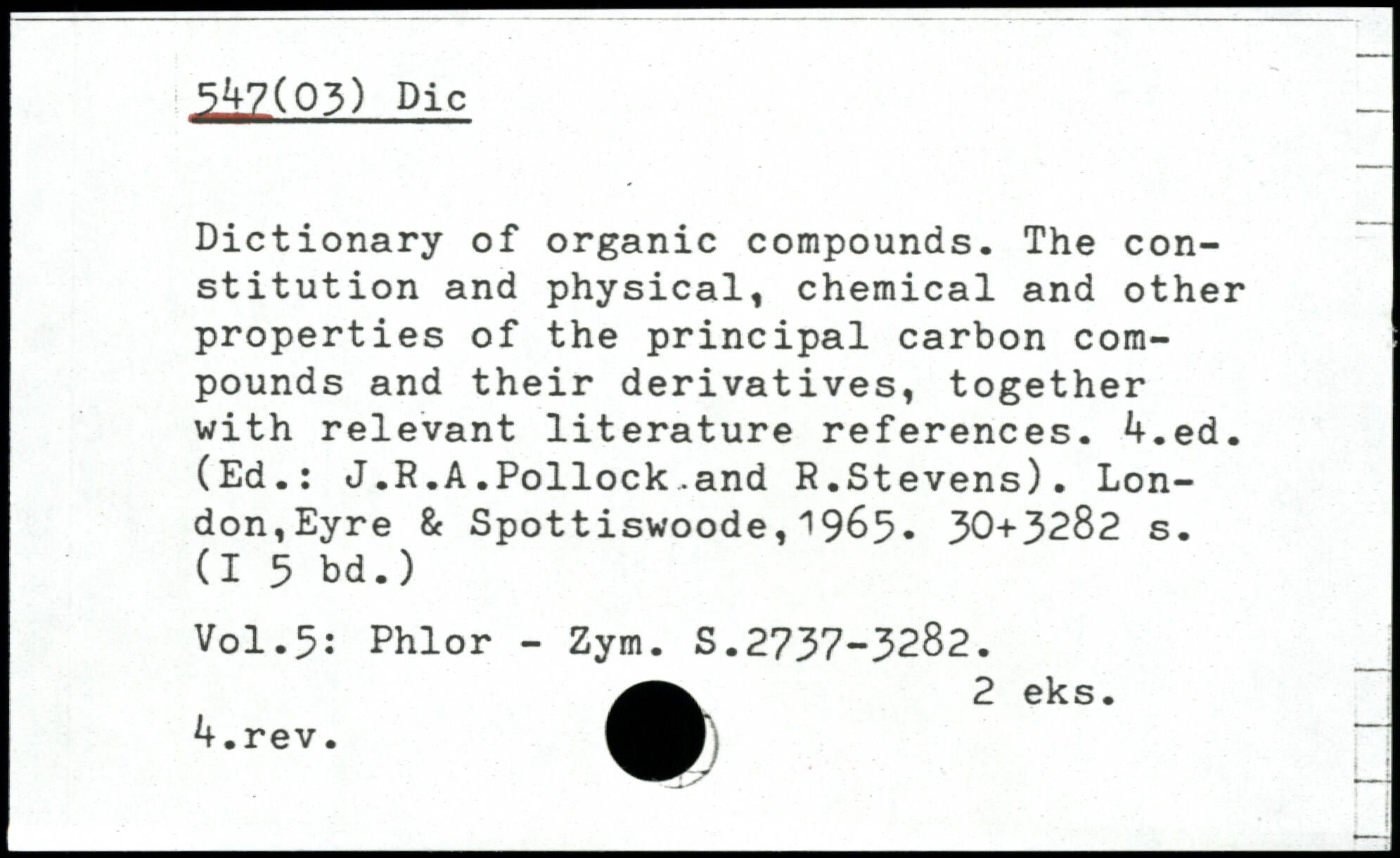 Dictionary of organic compounds. The constitution and physical, chemical and other properties of the principal carbon compounds and their derivatives, together with relevant literature references. .f.ed. (Ed.: J.R.A.Pollock.and R.Stevens).