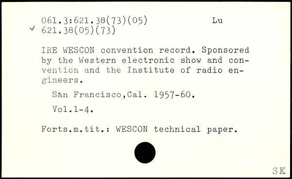 IRE WESCON convention record. Sponsored by the Western electronic show and convention and the Institute of radio engineers. Shn Francisco,Cal. 1957-60.
