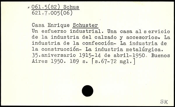 Casa Enrique Schuster Un esfuerzo industrial. Una casa al s ervicio de la industria del calzado y accesorios-r La industria de la confeccion- La industria de la construccion- La industria metalurgica. 35.aniversario 1915-14 de abril-1950o Buenos Aires 1950.
