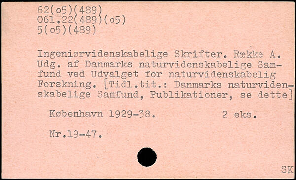 Ingeniørvidenskabelige Skrifter. Række A. Udg. af Danmarks naturvidenskabelige Samfund ved Udvalget for naturvidenskabelig forskning. [Tidl.tit.: Danmarks naturvidenskabelige Samfund, Publikationer, se dette]