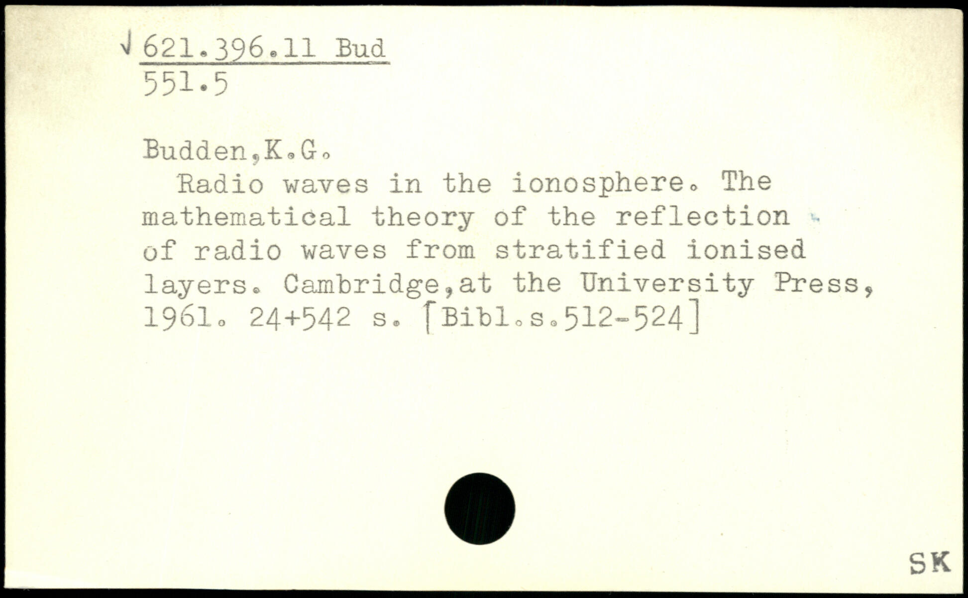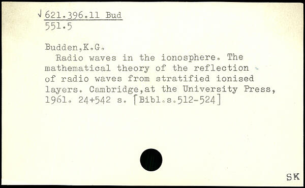 Budden,K,Go Radio waves in the ionosphere, The mathematical theory of the reflection '~ of radio waves from stratified ionised layers, Cambridge,at the University Press, 1961