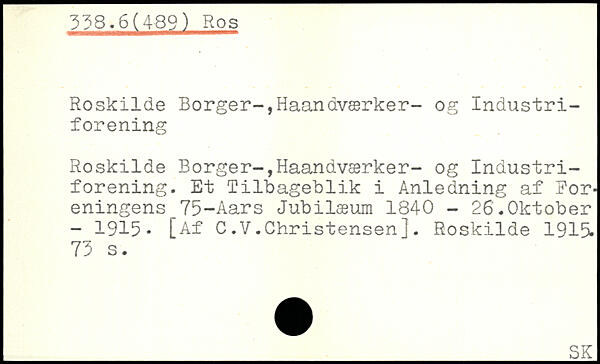 Roskilde Borger-,Haandværker- og Industriforening Roskilde Borger-,Haandværker- og Industriforening. Et Tilbageblik i Anledning af Foreningens 75-Aars Jubilæum 1840 - 26.Oktober - 1915. [Af C.V.Christensen j. Roskilde 1915.