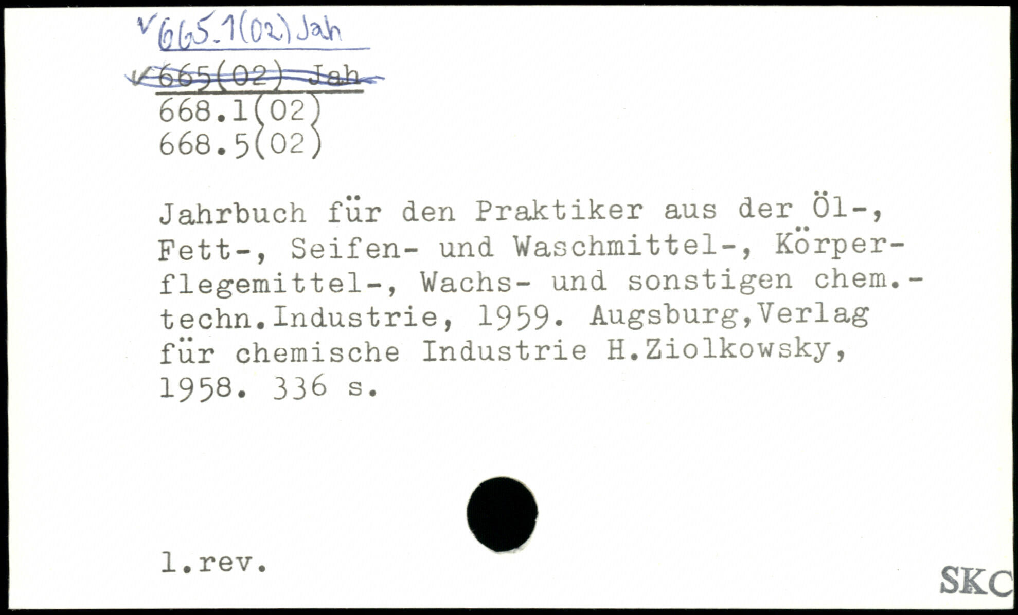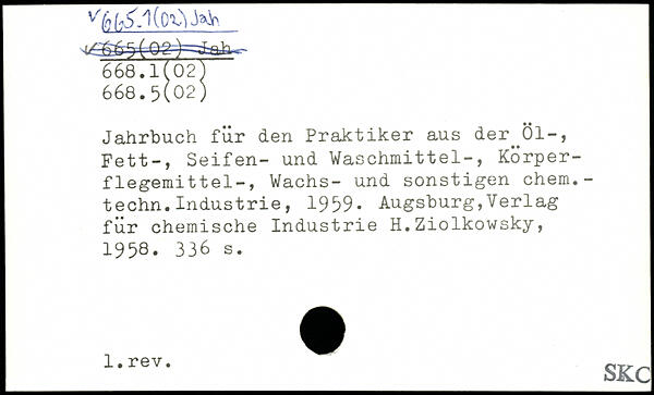 Jahrbuch für den Praktiker aus der^Öl-, Fett-, Seifen- und Waschmittel-, KÖrper-flegemittel-, Wachs- und sonstigen ehern.-techn.Industrie, 1959- Augsburg,Verlag für chemische Industrie H.Ziolkowsky, 1958.