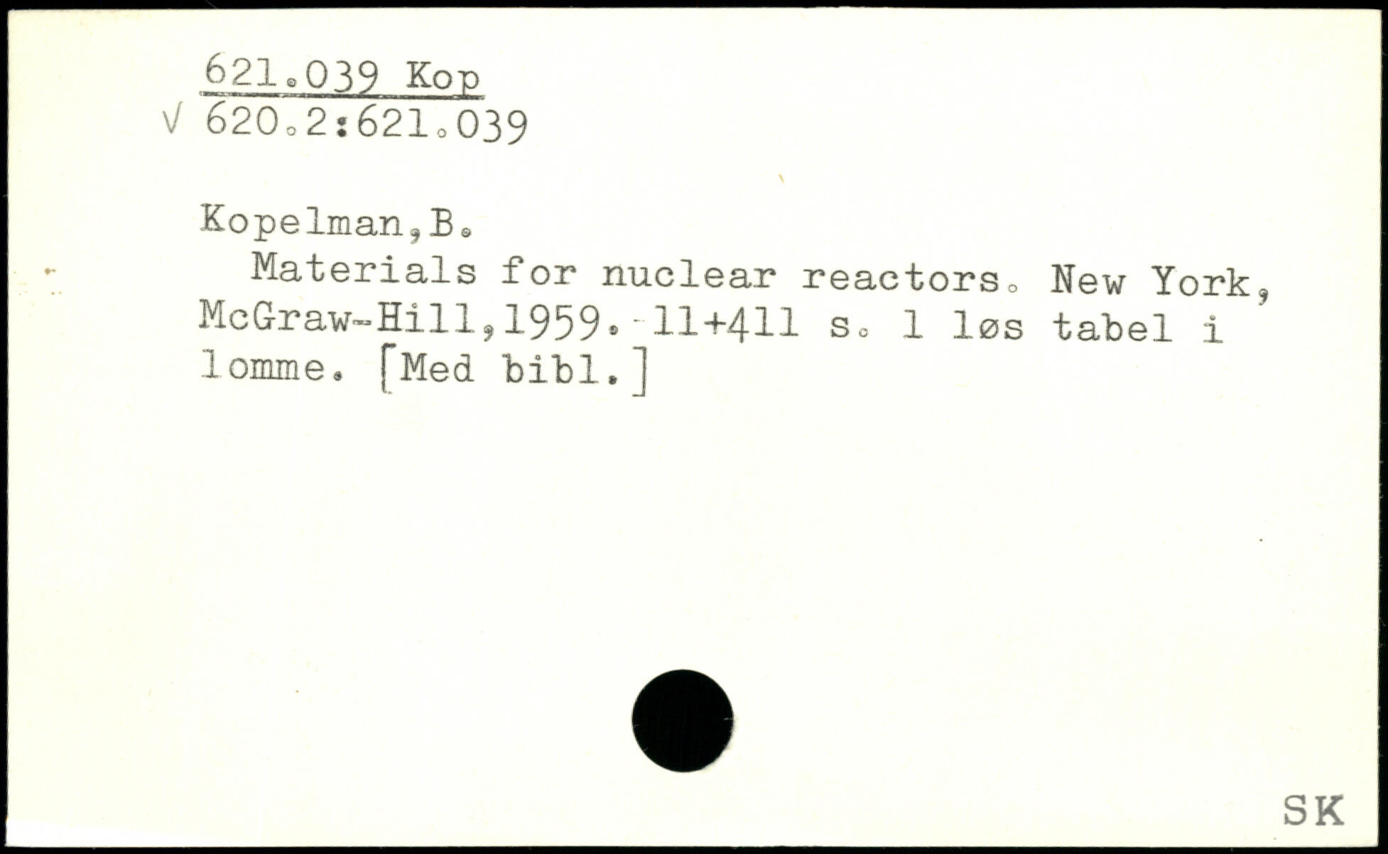 Kopelman?Bs Materials for nuclear reactors, New York, McGraw-Hillj1959.'II+4II sa 1 løs tabel i lomme. [Med bibl.]