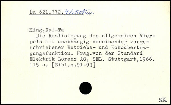 I Ming,Nai-Ta Die Realisierung des allgemeinen Vierpols mit unabhängig voneinander vorgeschriebener Betriebs- und Echoubertragungsfunktion. Hrsg.von der Standard Elektrik Lorenz AG, SEL. Stuttgart,1966.