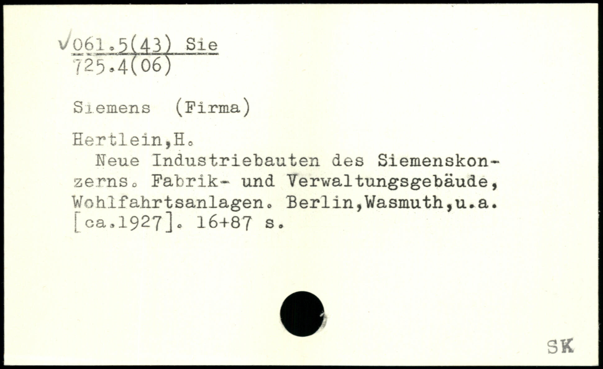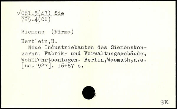 Hertlein,H. Neue Industriebauten des Siemenskon-zerns. Fabrik- und Verwaltungsgebäude, Wohlfahrtsanlagenc Berlin,Wasmuth,u.a.