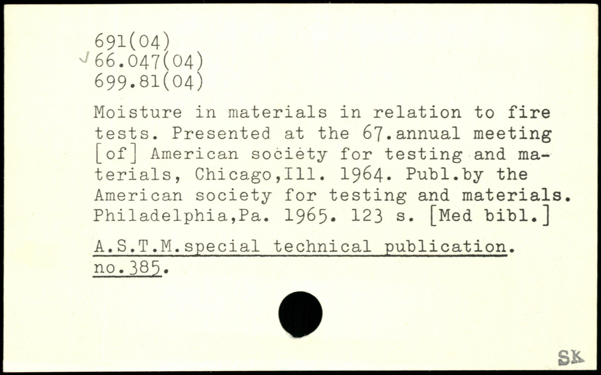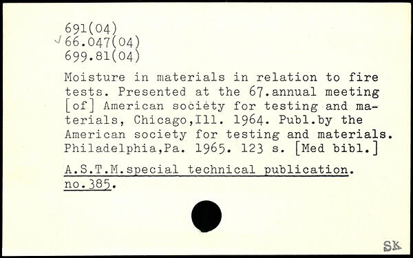 Moisture in materials in relation to fire tests. Presented at the 67.annual meeting [of] American society for testing and materials, Chicago,111. 1964.