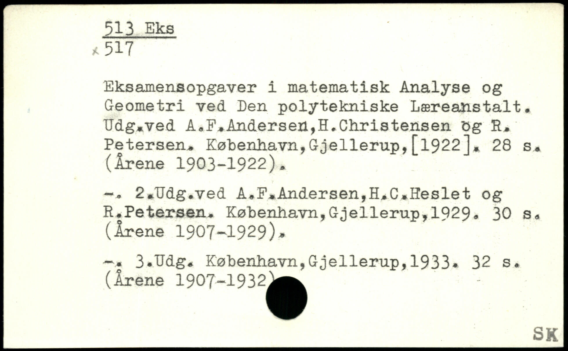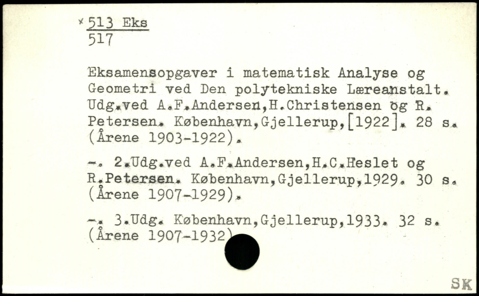 Eksamensopgaver i matematisk Analyse og Geometri ved Den polytekniske Læreanstalt. TJdg,ved A.F,Andersen,H.