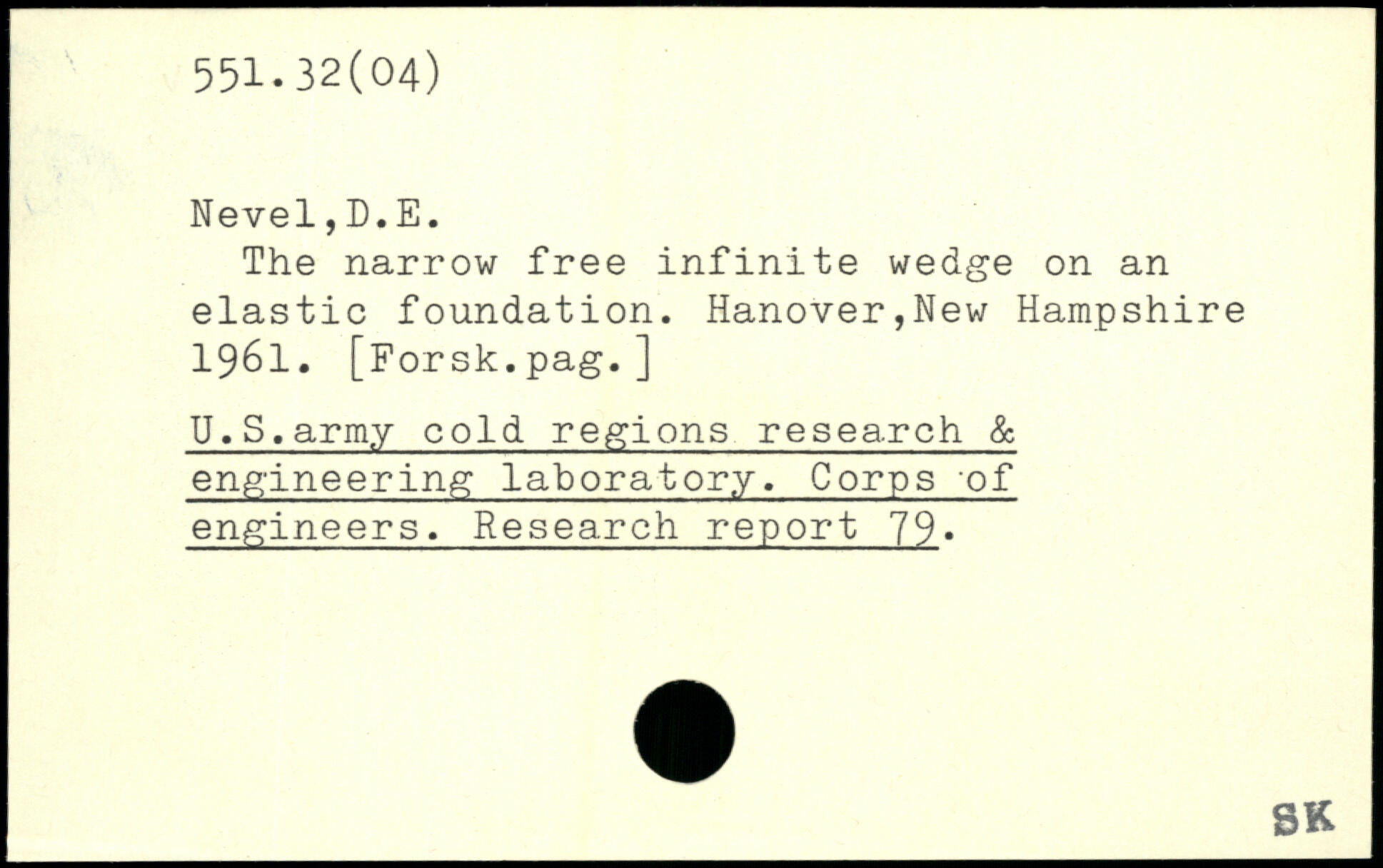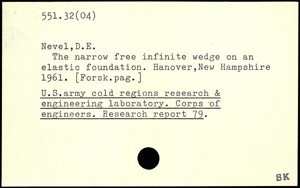 The narrow free infinite wedge on an elastic foundation. Hanover,New Hampshire 1961. [Forsk.pag.] U.S.army cold regions research & engineering laboratory. Corps of engineers. Research report 79-