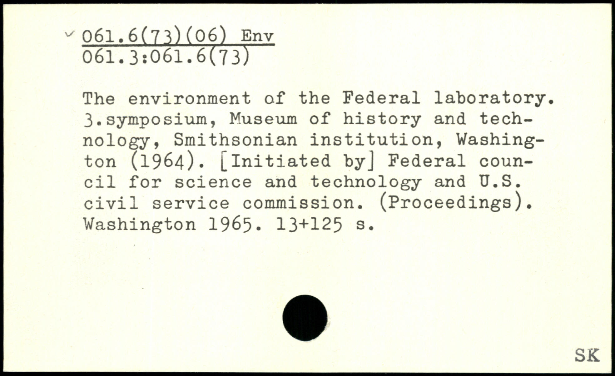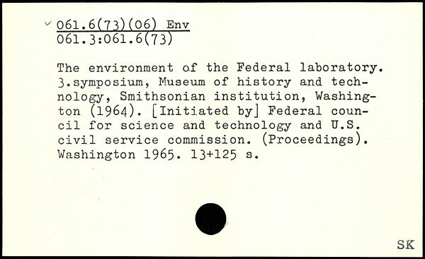The environment of the Federal laboratory. 3.symposium, Museum of history and technology, Smithsonian institution, Washington (1964). [initiated by] Federal council for science and technology and U.S. civil service commission. (Proceedings).
