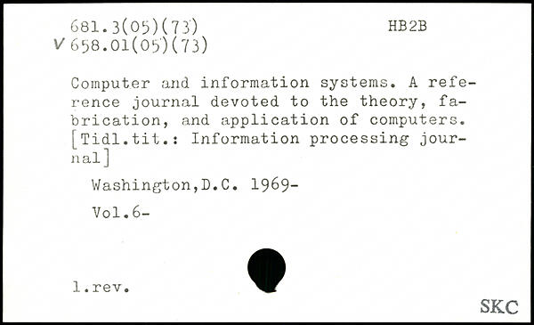 Computer and information systems. A reference journal devoted to the theory, fabrication, and application of computers. [Tidl.tit.: Information processing jour- n al ] Washington,D.C. 1969-