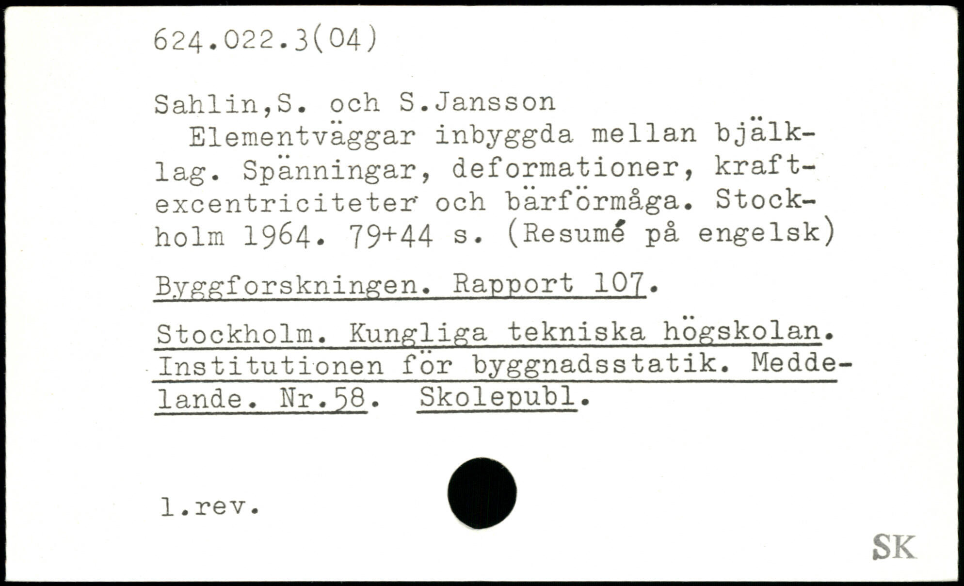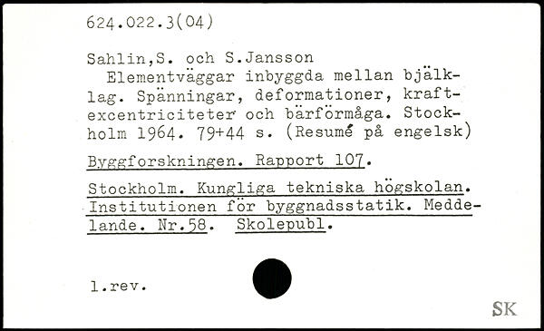 Elementväggar inbyggda mellan bjälklag. Spänningar, deformationer, kraft-excentriciteter' och barformåga.