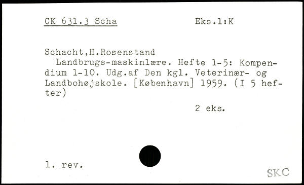 Schacht,H.Rosenstand Landbrugs-maskinlære. Hefte 1-5: Kompendium 1-10. Udg.af Den kgl. Veterinær- og Landbohøjskole.
