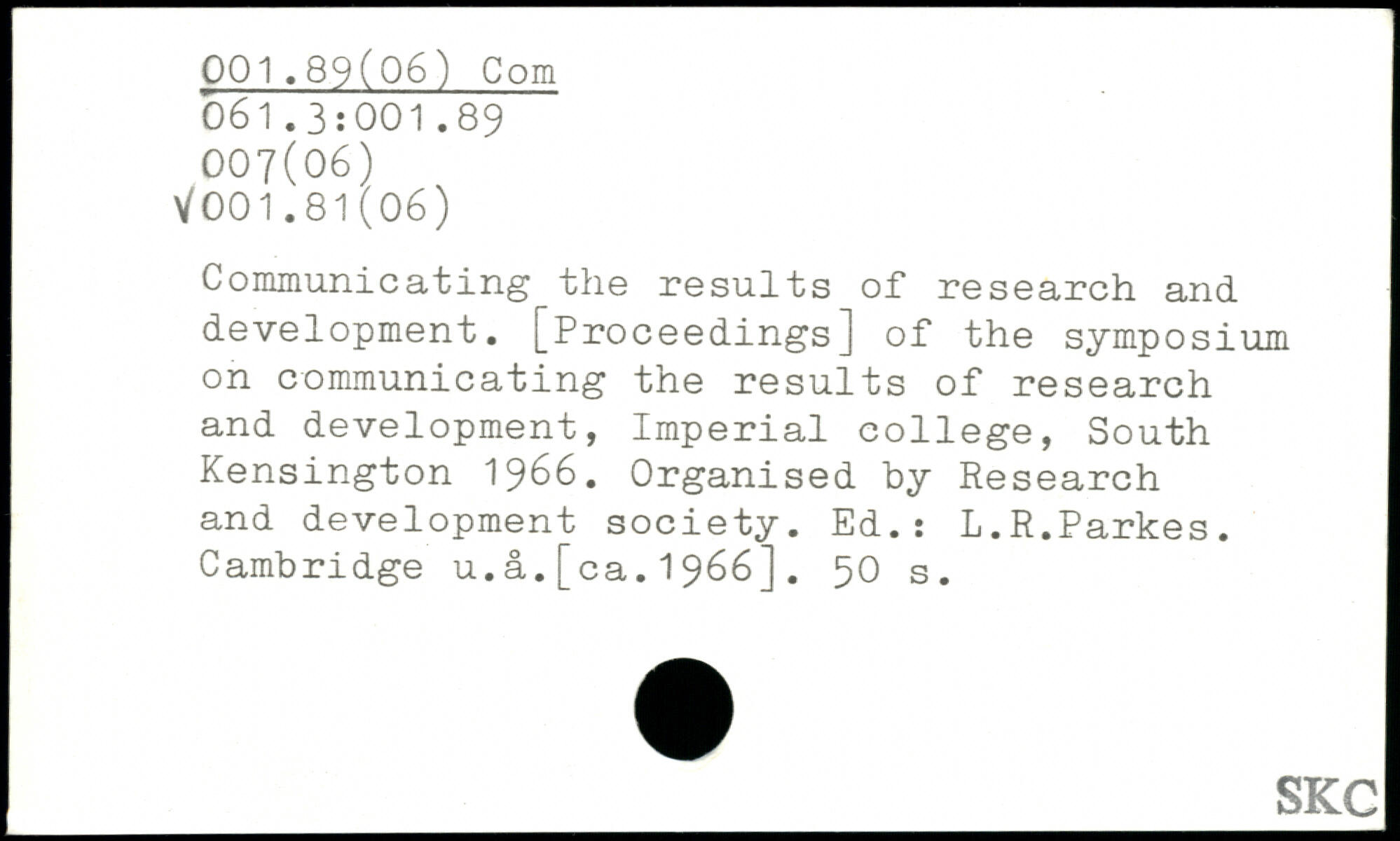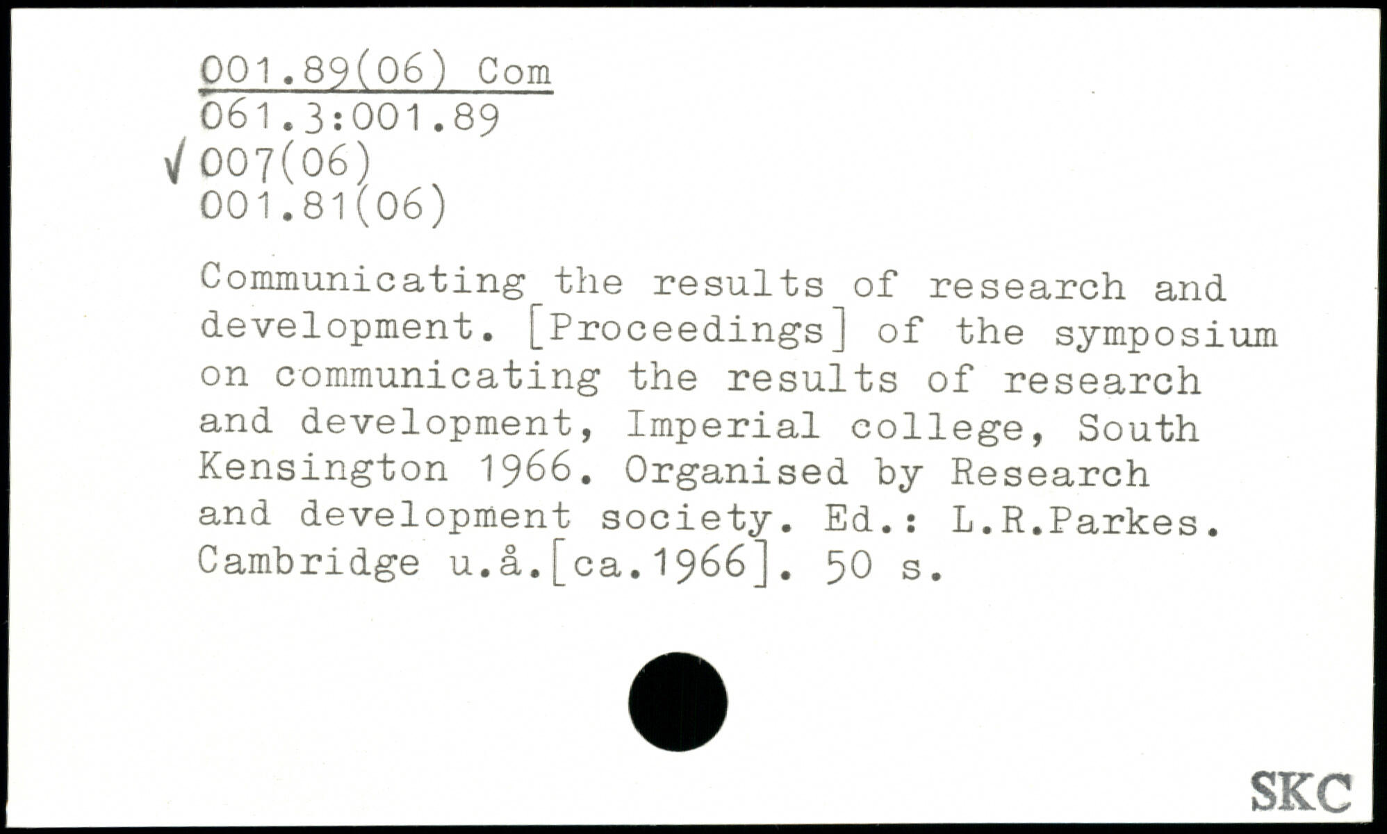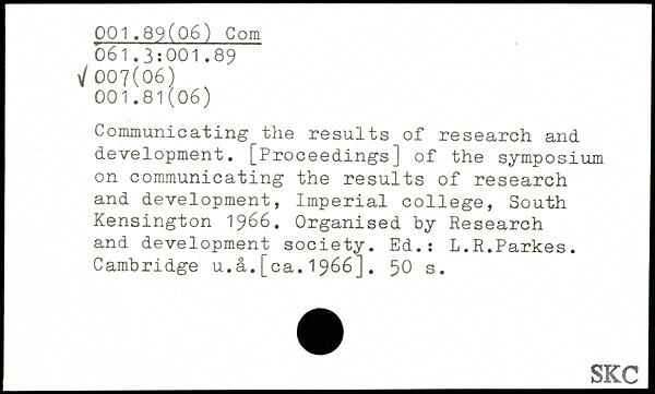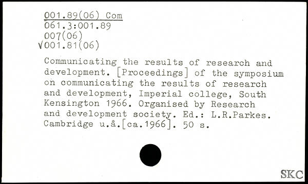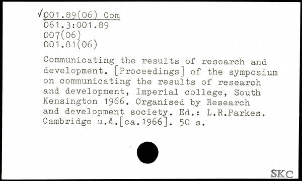 Communicating the results of research and development. [Proceedings] of the symposium on communicating the results of research and development, Imperial college, South Kensington 1966. Organised by Research and development society. Ed.: L.R.Parkes. Cambridge u.a.[ca.1966].