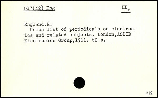 Union list of periodicals on electronics and related subjects. London,ÅSLIB Electronics Group,1961.