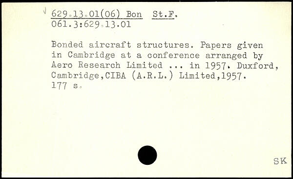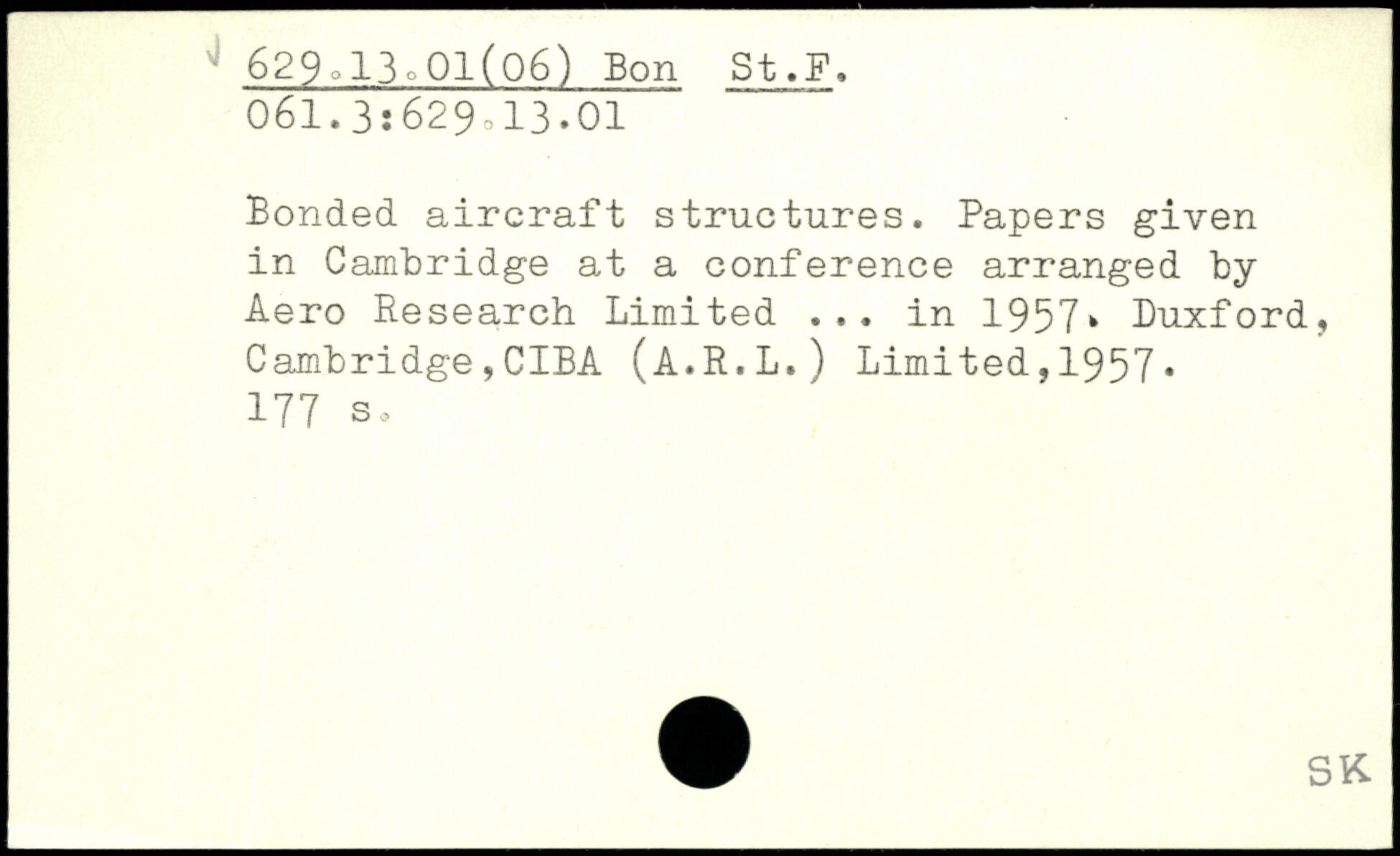 Bonded aircraft structures. Papers given in Cambridge at a conference arranged by Aero Research Limited ... in 1957, Duxford, Cambridge,CIBA (A.R.L.) Limited,1957.