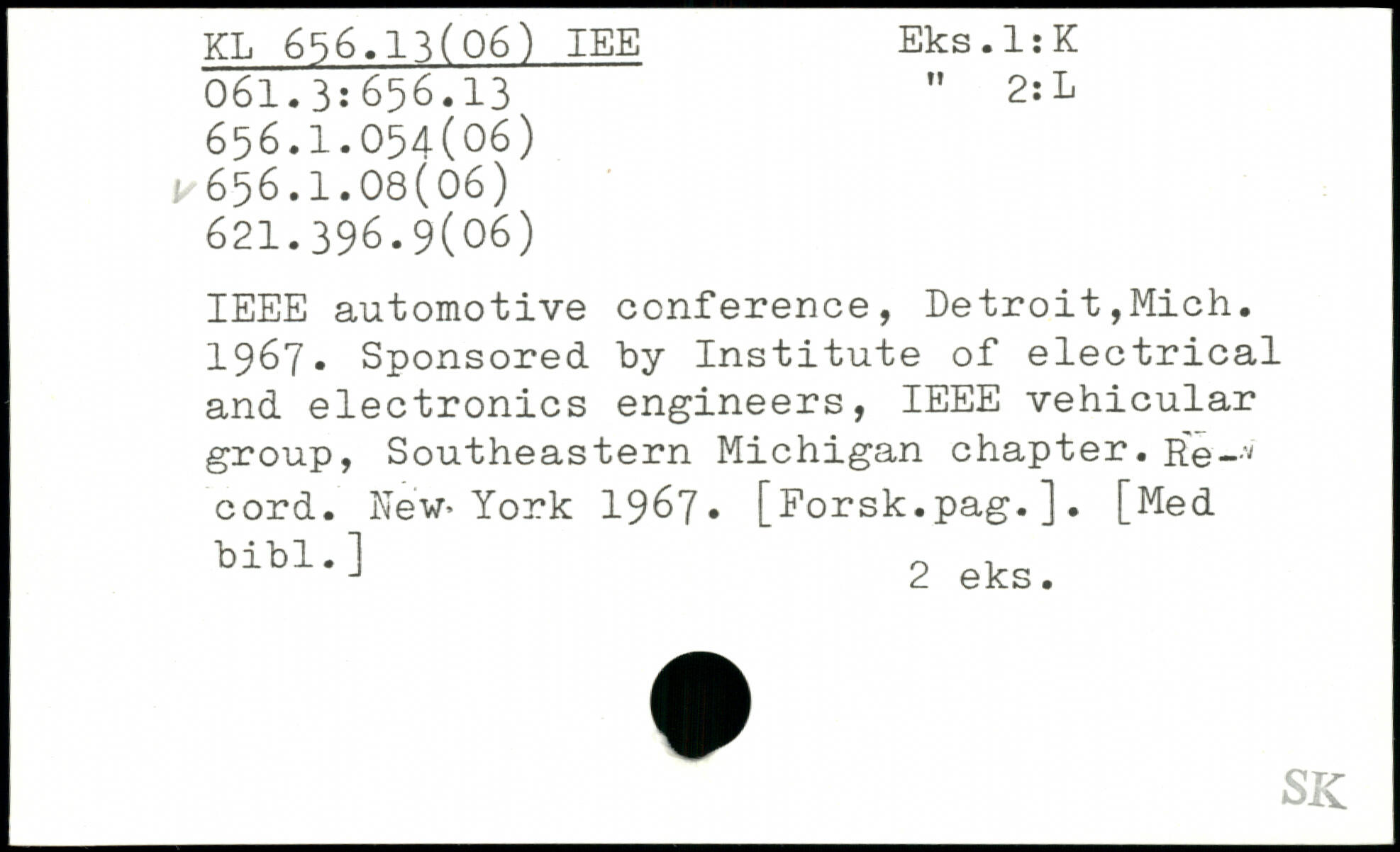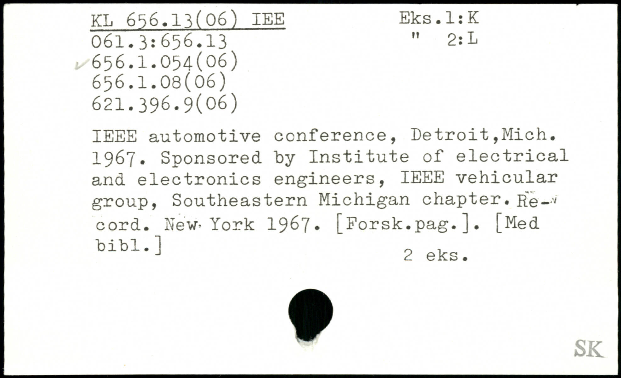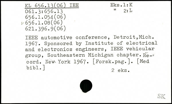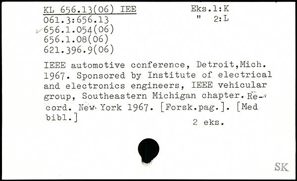 IEEE automotive conference, Detroit,Mich. 1967. Sponsored by Institute of electrical and electronics engineers, IEEE vehicular group, Southeastern Michigan chapter. Re—7 cord. New.York 1967, [Porsk.pag.]. [Med blb1.^ 2 eks.
