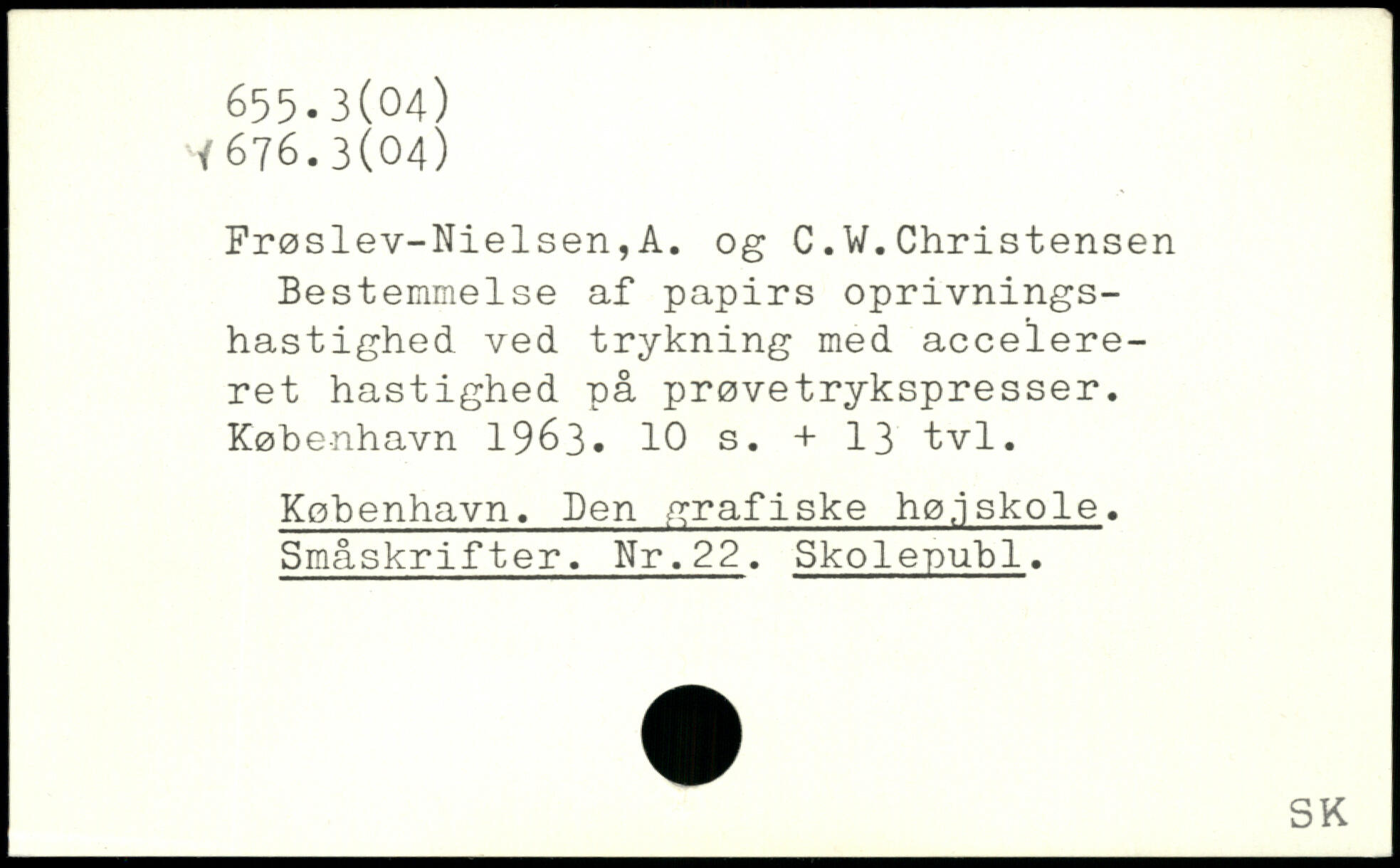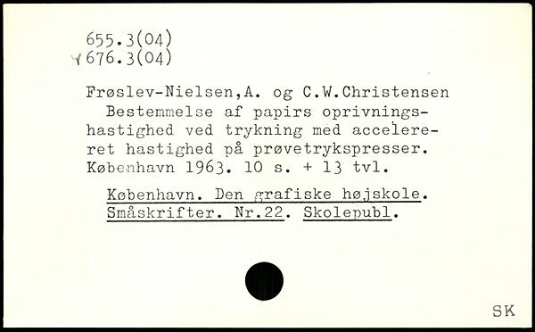 Frøslev-Nielsen,A. og C.W.Christensen Bestemmelse af papirs oprivnings-hastighed ved trykning med accelereret hastighed på prøvetrykspresser. København 19&3.