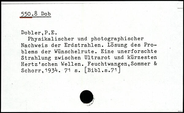 Physikalischer und photographischer Nachweis der Erdstrahlen. Lösung des Problems der Wünschelrute. Eine unerforschte Strahlung zwischen Ultrarot und kürzesten Hertz'schen Wellen. Feuchtwangen,Sommer & Schorr,193^. 7^ s.