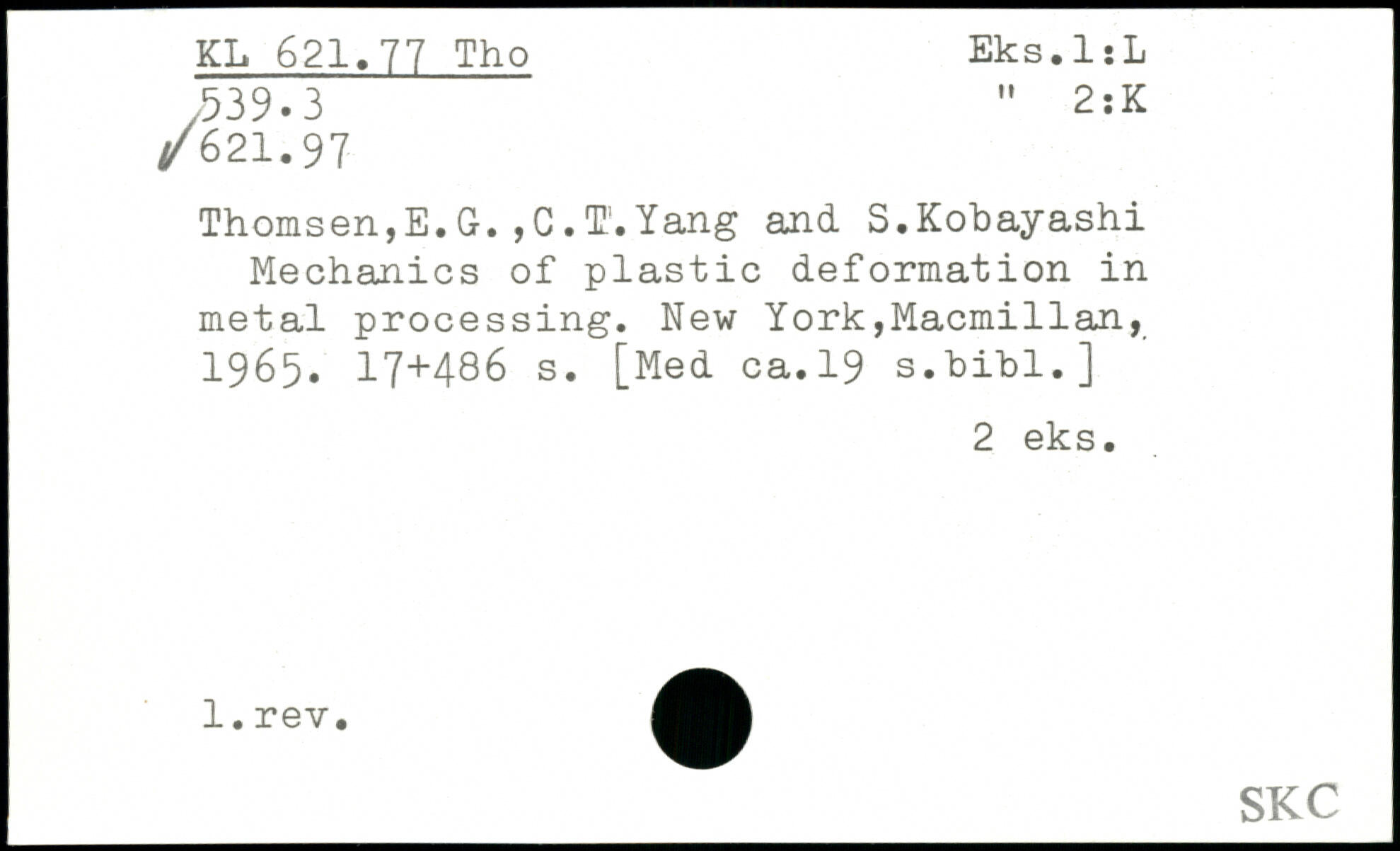 Thomsen,E. G. , C.T'.Yang and S.Kobayashi Mechanics of plastic deformation in metal processing.