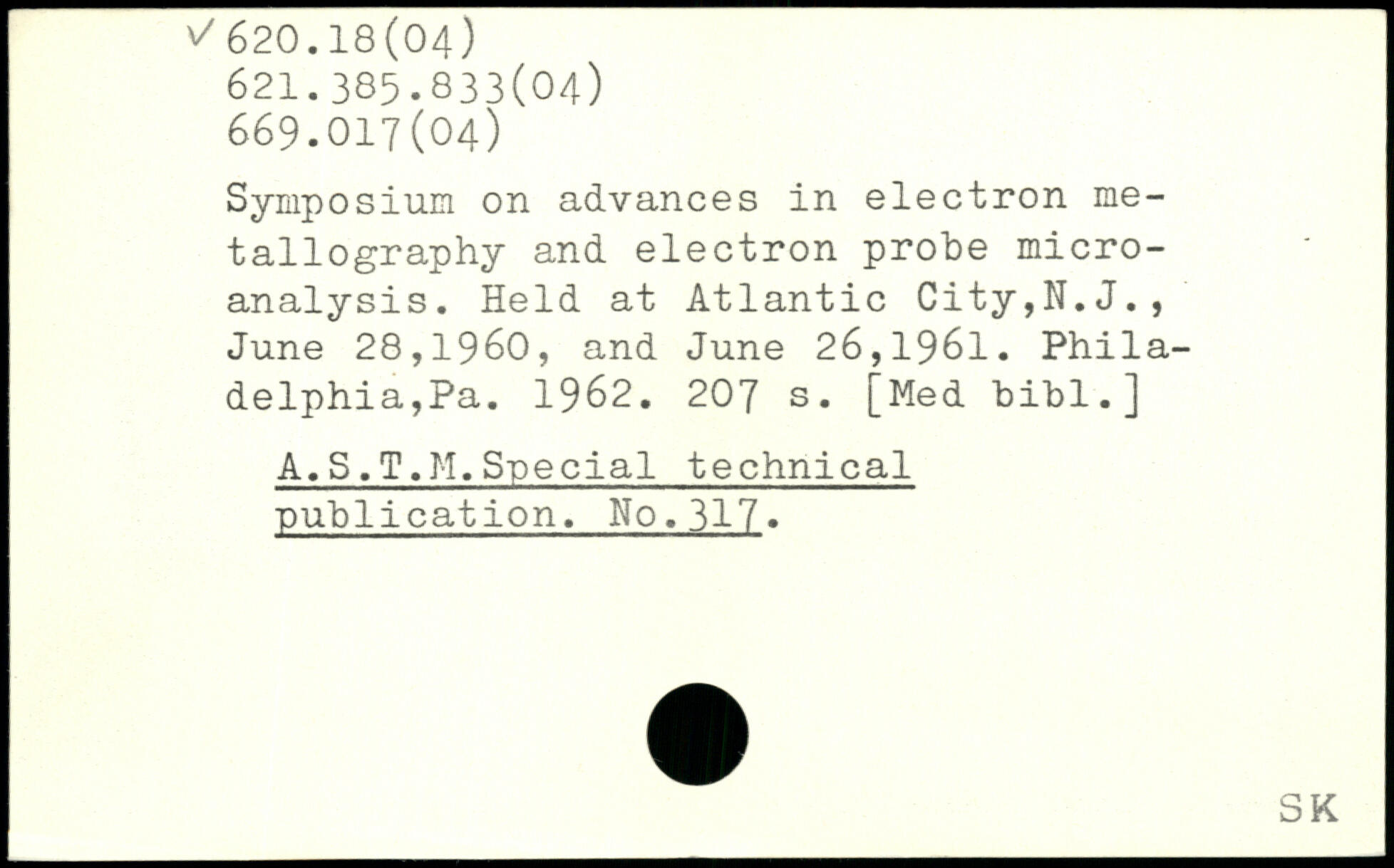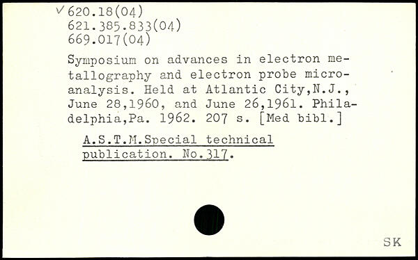 Symposium on advances in electron metallography and electron probe microanalysis. Held at Atlantic City,N.J., June 28,1960, and June 26,1961. Philadelphia,Pa. 1962.