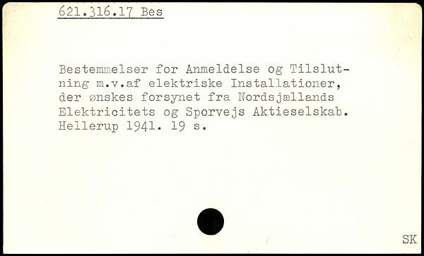 Bestemmelser for Anmeldelse og Tilslutning m.v.af elektriske Installationer, der ønskes forsynet fra Nordsjællands Elektricitets og Sporvejs Aktieselskab. Hellerup 1941
