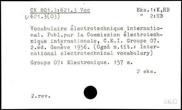 Vocabulaire électrotechnique international. Publ.par la Commission electrotech-nique internationale, C.E.I. Groupe 07, 2.éd. Genève 1956. (Ogsâ m.tit.: International electrotechnical vocabulary) Groupe O']: Electronique.