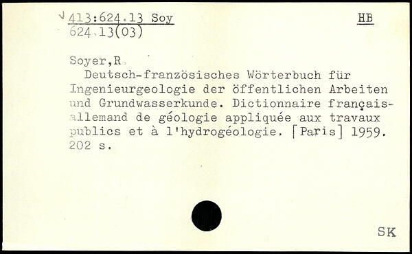 Soyer,Ra Deutsch-französisches Wörterbuch für Ingenieurgeologie der öffentlichen Arbeiten und Grundwasserkunde. Dictionnaire français-allemand de géologie appliquée aux travaux publics et à 1.hydrogéologie
