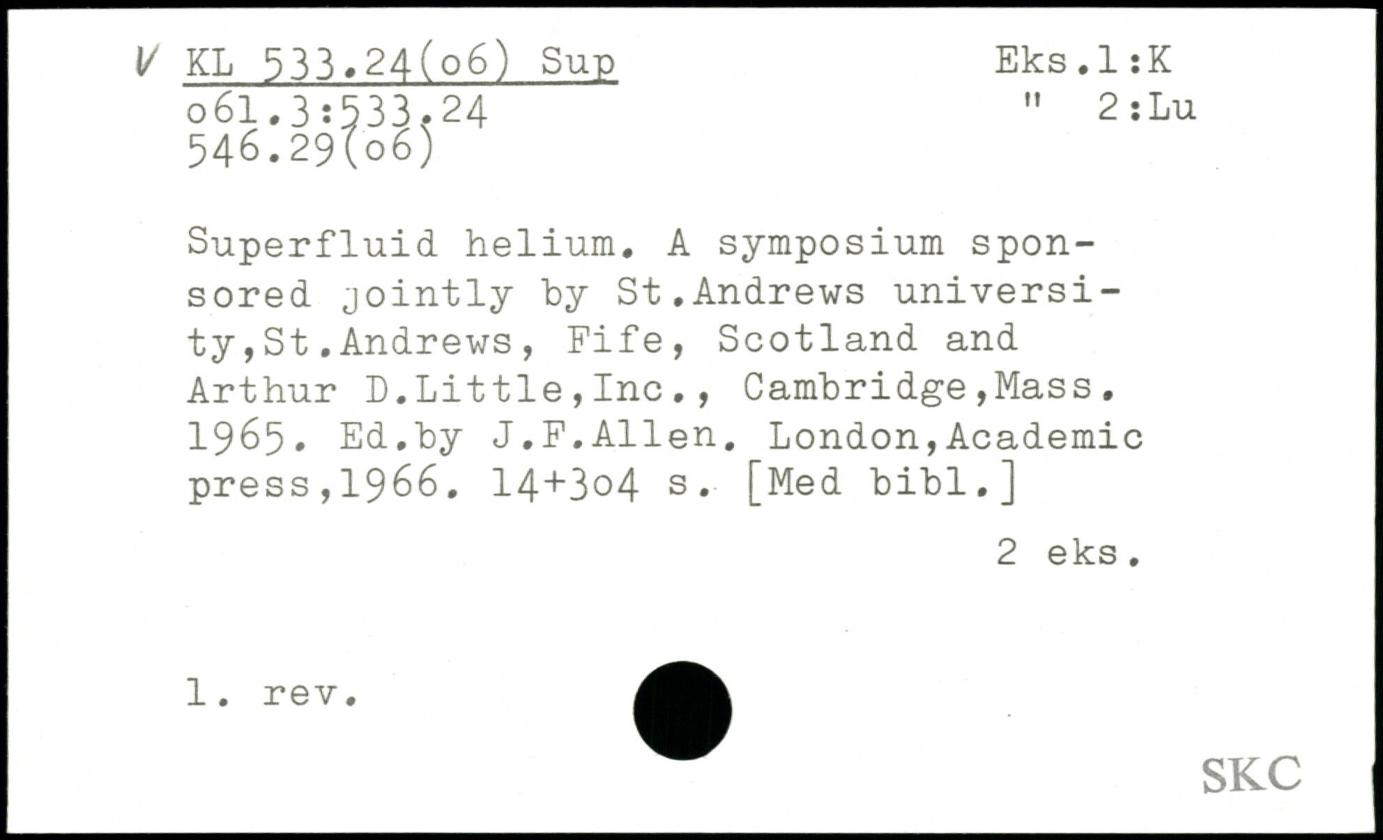 Superfluid helium. A symposium sponsored jointly by St.Andrews university , St .Andrews , Fife, Scotland and Arthur D.Littie,Inc., Cambridge,Mass. 1965. Ed,by J.F.