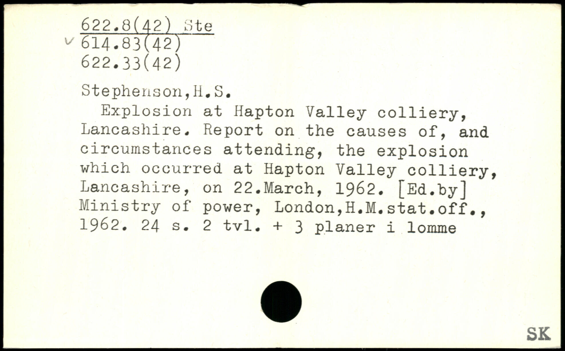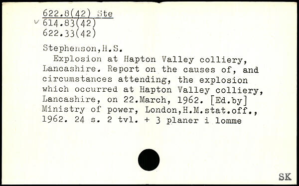 Explosion at Hapton Valley colliery, Lancashire. Report on the causes of, and circumstances attending, the explosion which occurred at Hapton Valley colliery, ! Lancashire, on 22.March, 1962. [Ed.by] ] Ministry of power, London,H.M.stat.off., 1962.