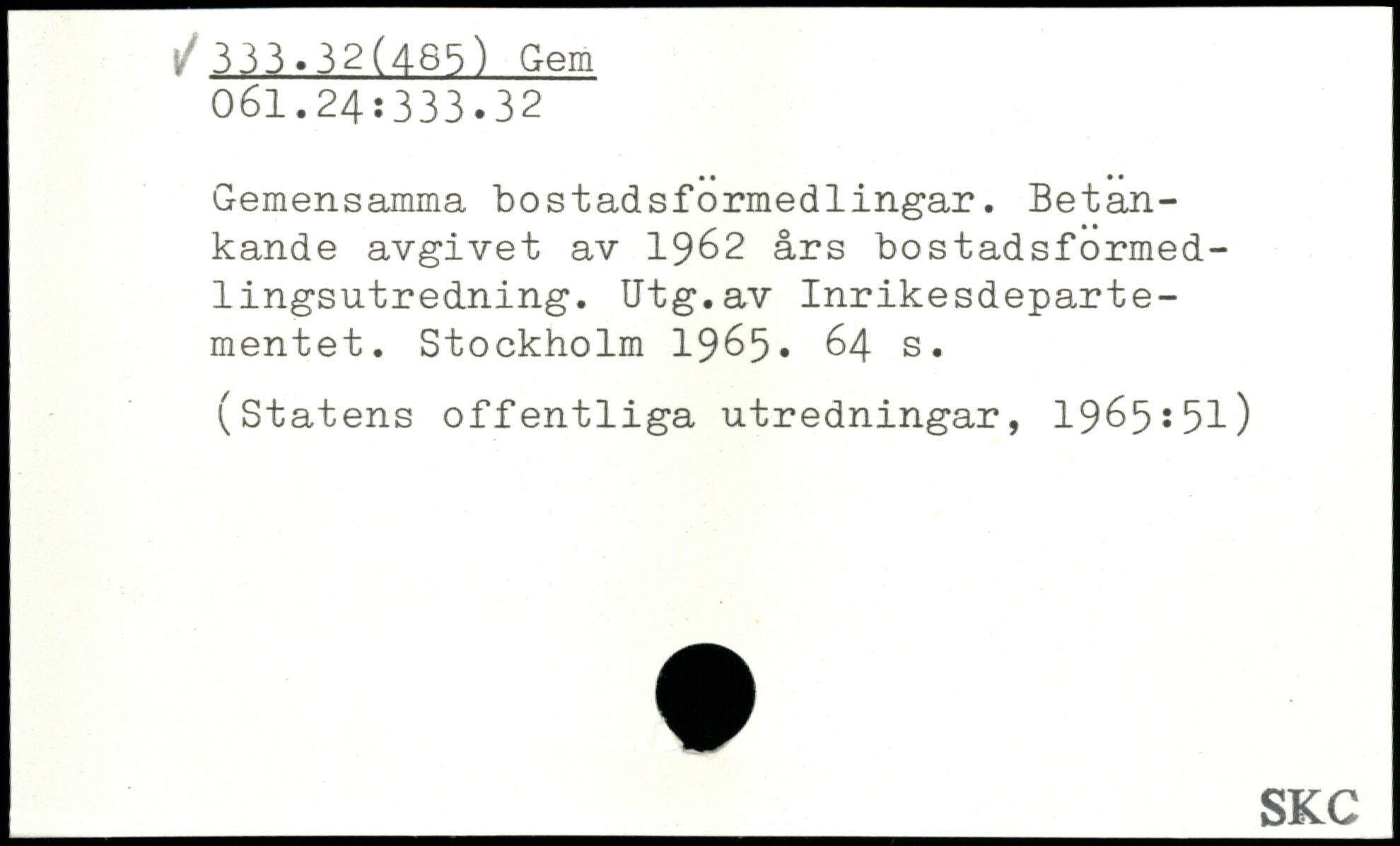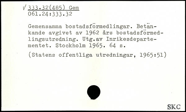 Gemensamma bostadsformedlingar. Betankande avgivet av 1962 års bostadsformed-lingsutredning. Utg.av Inrikesdepartementet. Stockholm 19&5