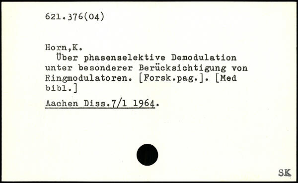 Uber phasenselektive Demodulation unter besonderer Berücksichtigung von Ringmodulatoren. [Forsk.pag.]. [Med bibl. ] Aachen Diss.7/l 1964.
