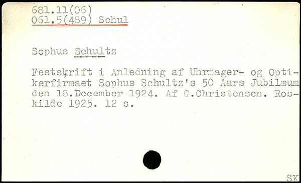 Festskrift i Anledning af Uhrmager- og Optikerfirmaet Sophus Schultz's 50 Åars Jubilæum den 18.December 1924. Af G.Christensen. Roskilde 1925.