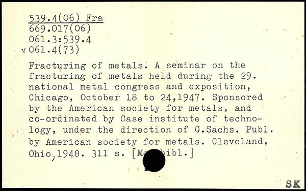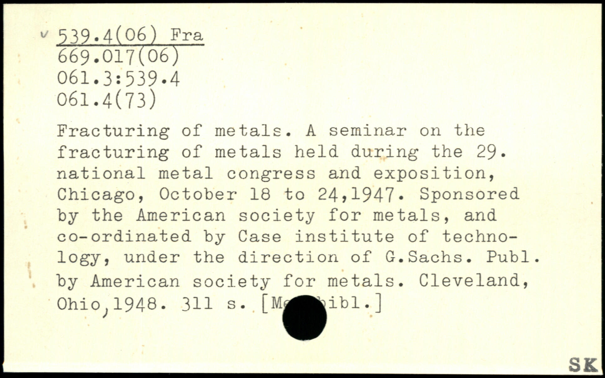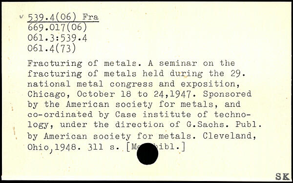 Fracturing of metals. A seminar on the fracturing of metals held during the 29. national metal congress and exposition, Chicago, October 18 to 24,1947. Sponsored by the American society for metals, and co-ordinated by Case institute of technology, under the direction of G.Sachs.