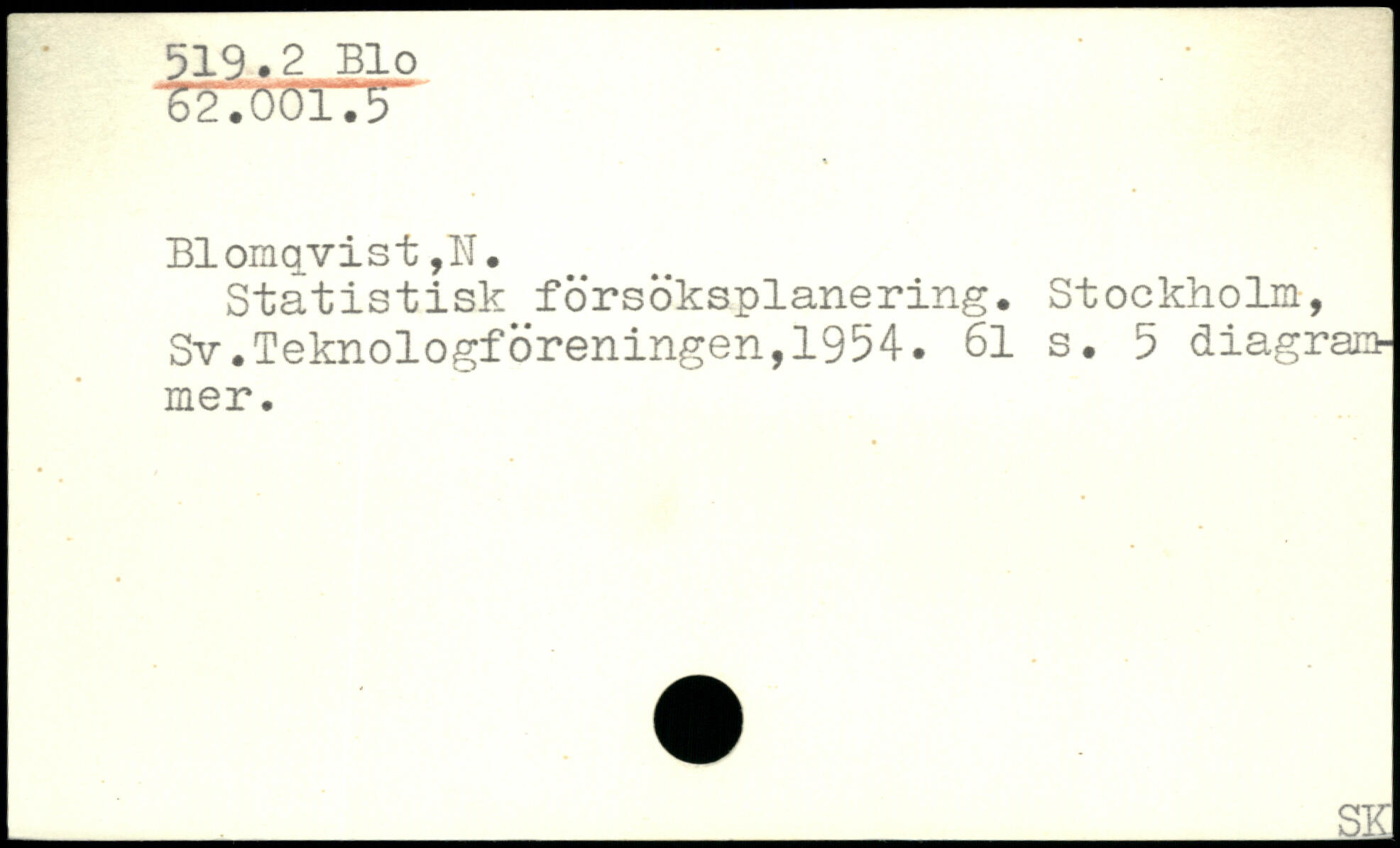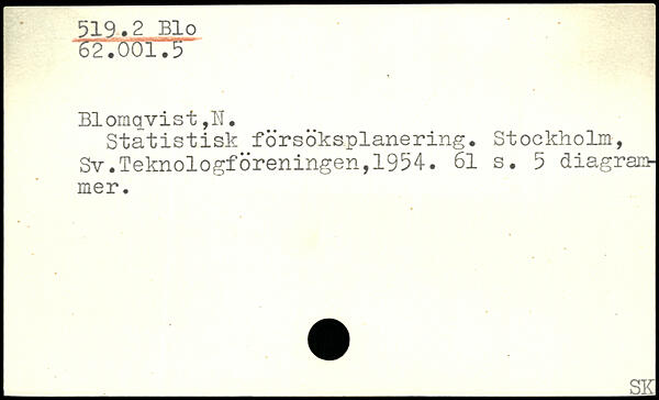 Statistisk försöksplanering. Stockholm, Sy.Teknologforeningen,1954.